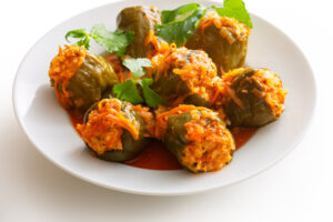 ピーマンの緑や、トマトの赤がきいた、色鮮やかなメインディッシュ。お肉とご飯が詰まっていて、食べ応え満点!